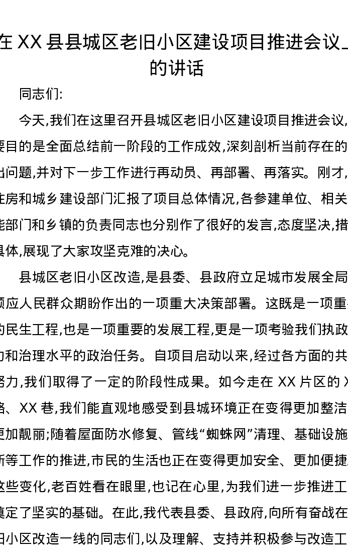 在XX县县城区老旧小区建设项目推进会议上的讲话