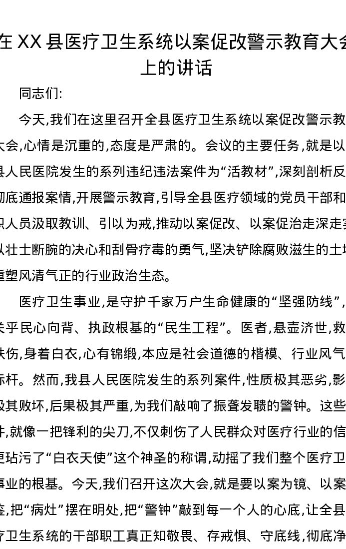 在XX县医疗卫生系统以案促改警示教育大会上的讲话