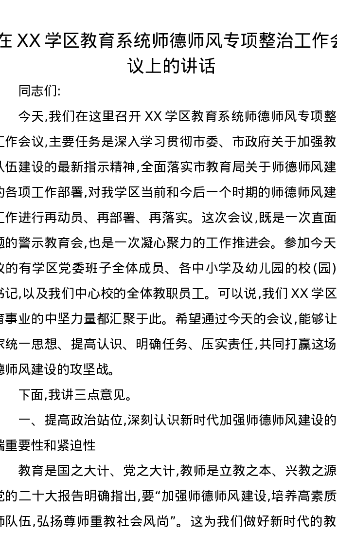 在XX学区教育系统师德师风专项整治工作会议上的讲话