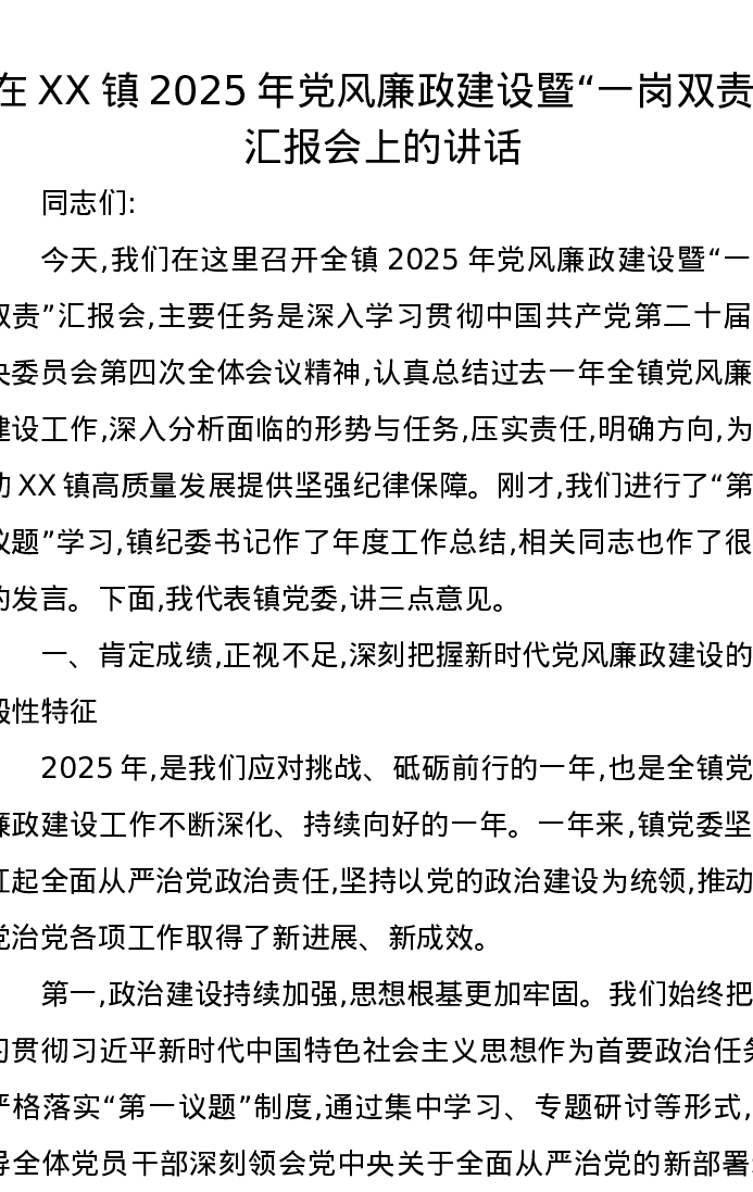 在XX镇2025年党风廉政建设暨“一岗双责”汇报会上的讲话