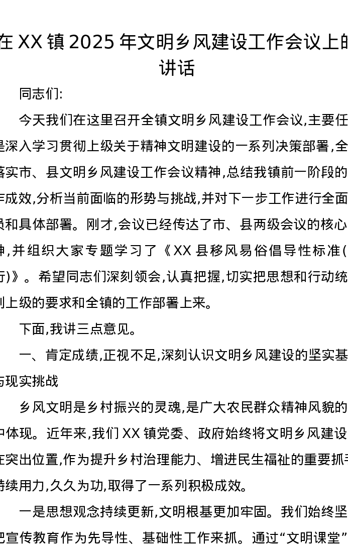 在XX镇2025年文明乡风建设工作会议上的讲话