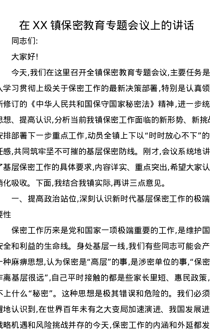 在XX镇保密教育专题会议上的讲话
