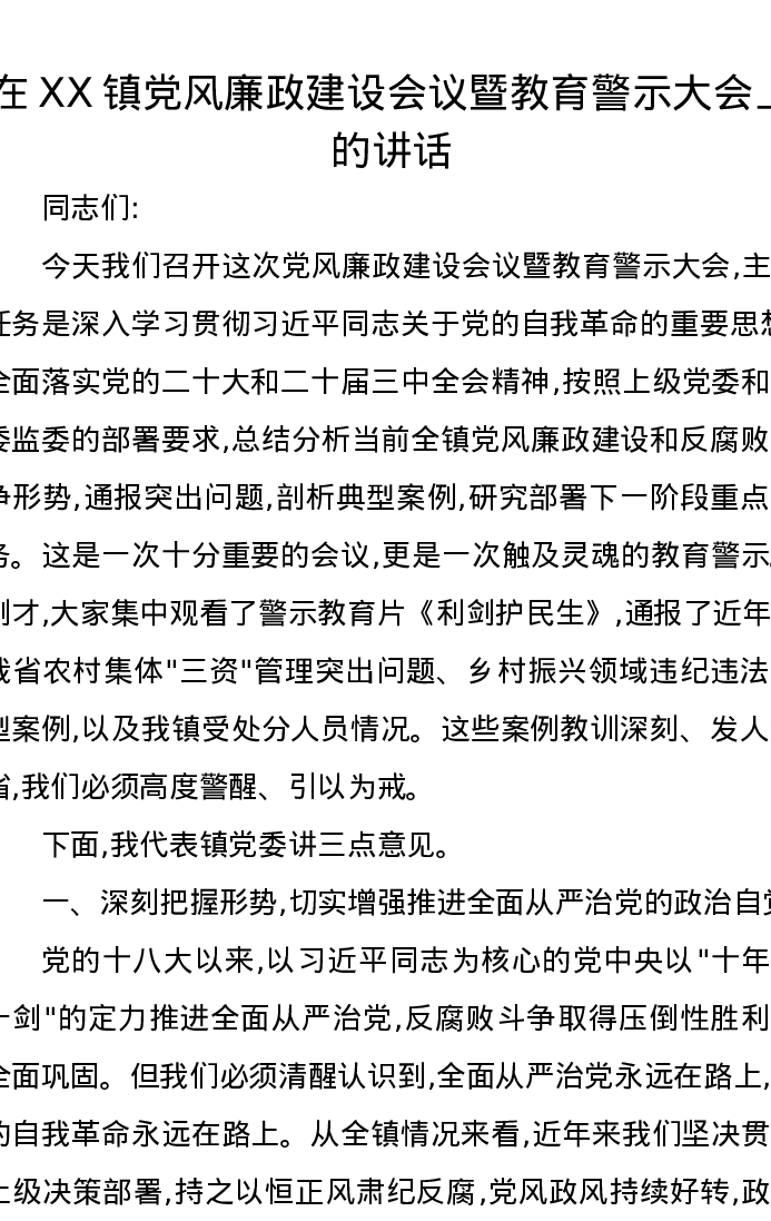 在XX镇党风廉政建设会议暨教育警示大会上的讲话