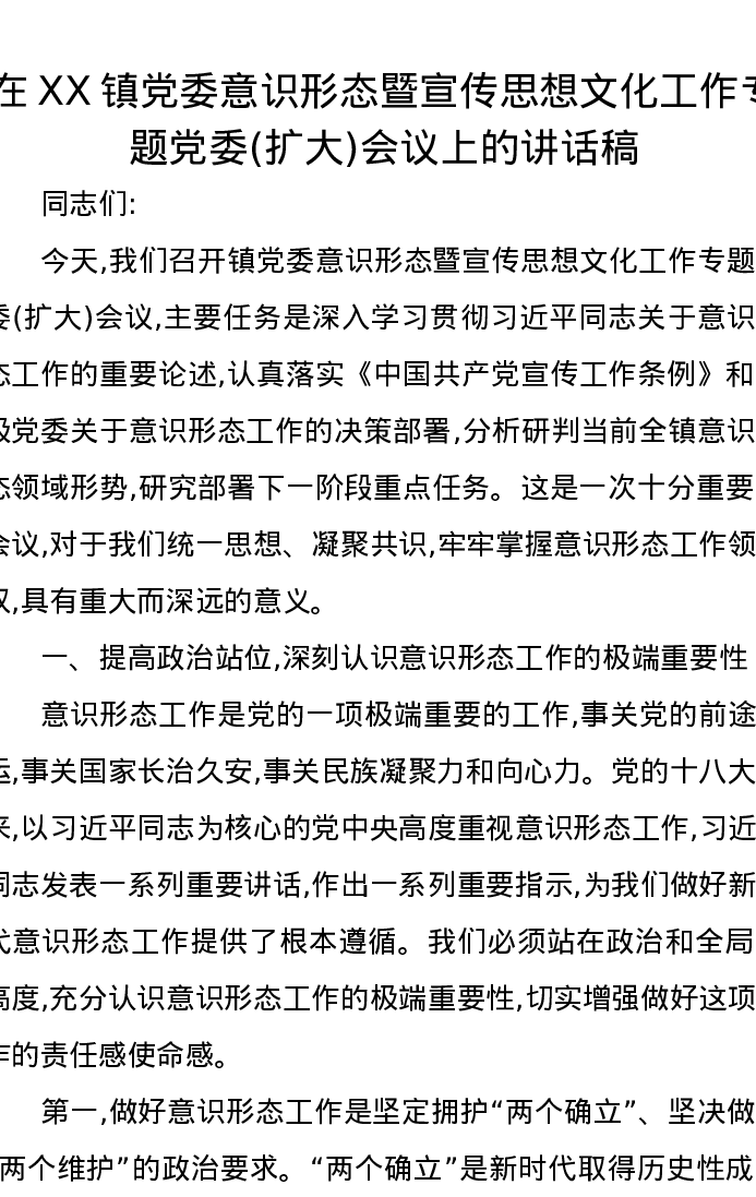 在XX镇党委意识形态暨宣传思想文化工作专题党委(扩大)会议上的讲话稿