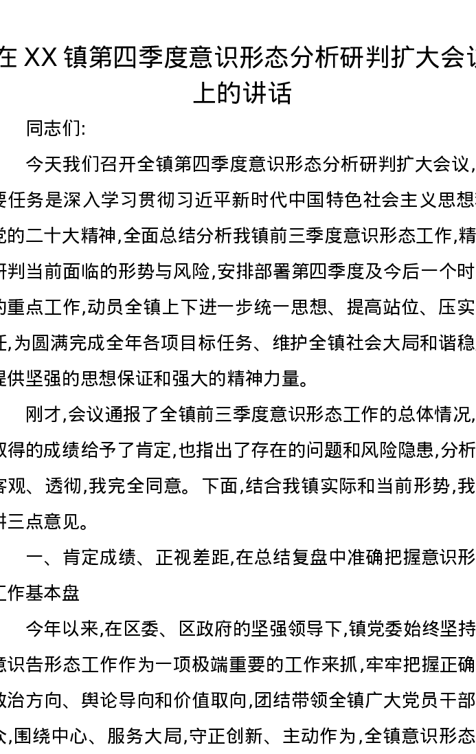 在XX镇第四季度意识形态分析研判扩大会议上的讲话