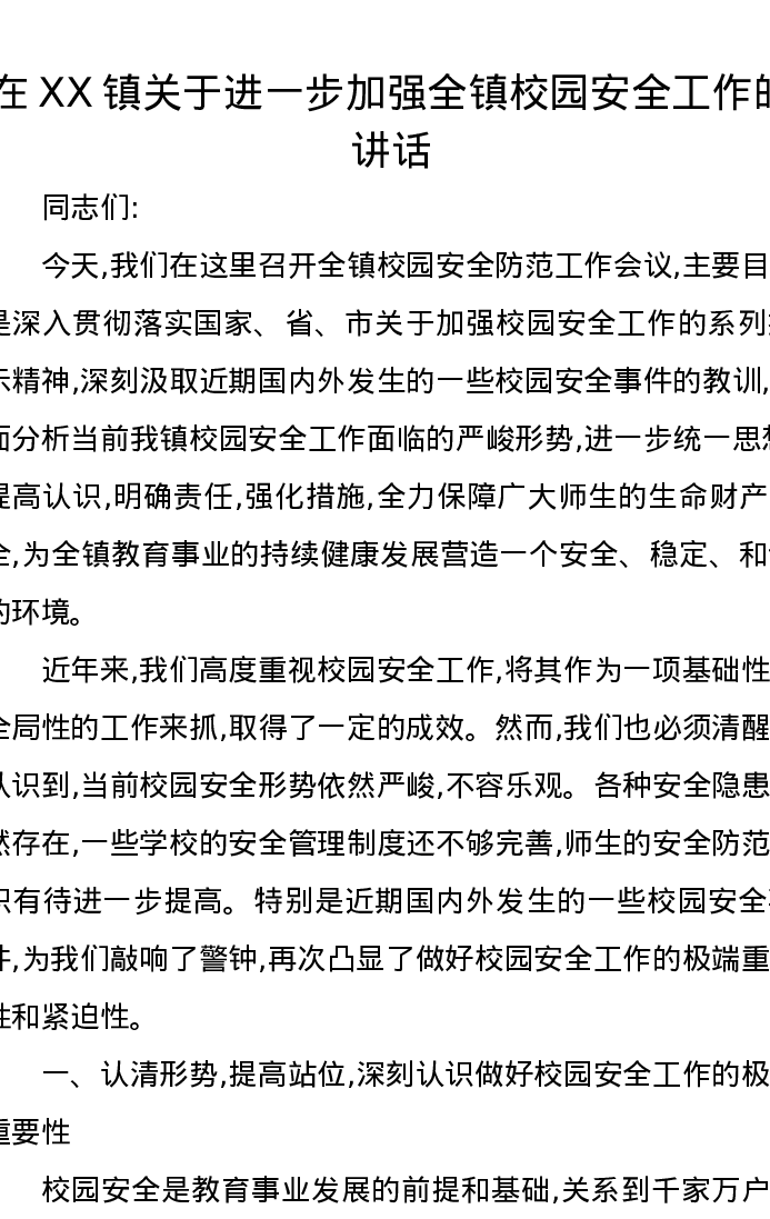 在XX镇关于进一步加强全镇校园安全工作的讲话