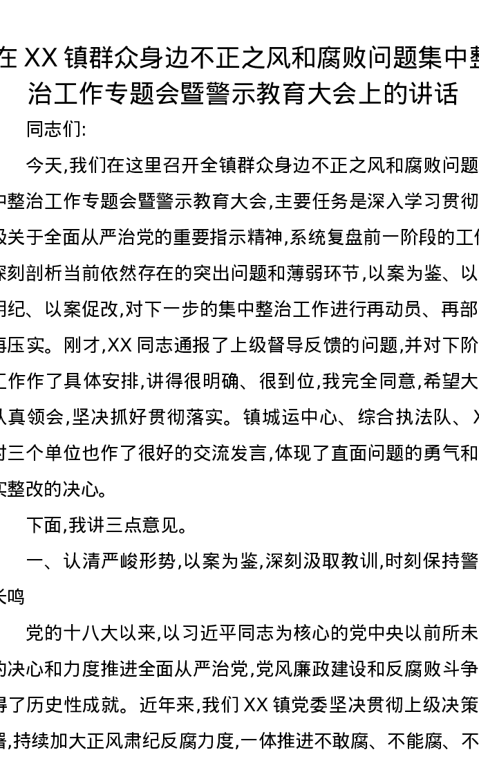 在XX镇群众身边不正之风和腐败问题集中整治工作专题会暨警示教育大会上的讲话