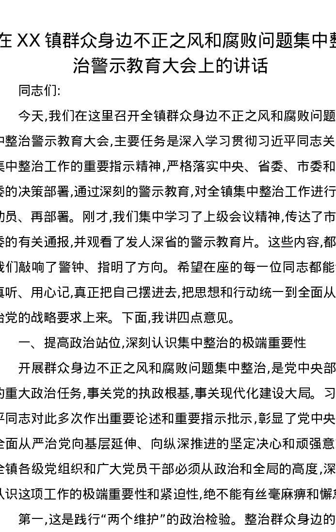 在XX镇群众身边不正之风和腐败问题集中整治警示教育大会上的讲话