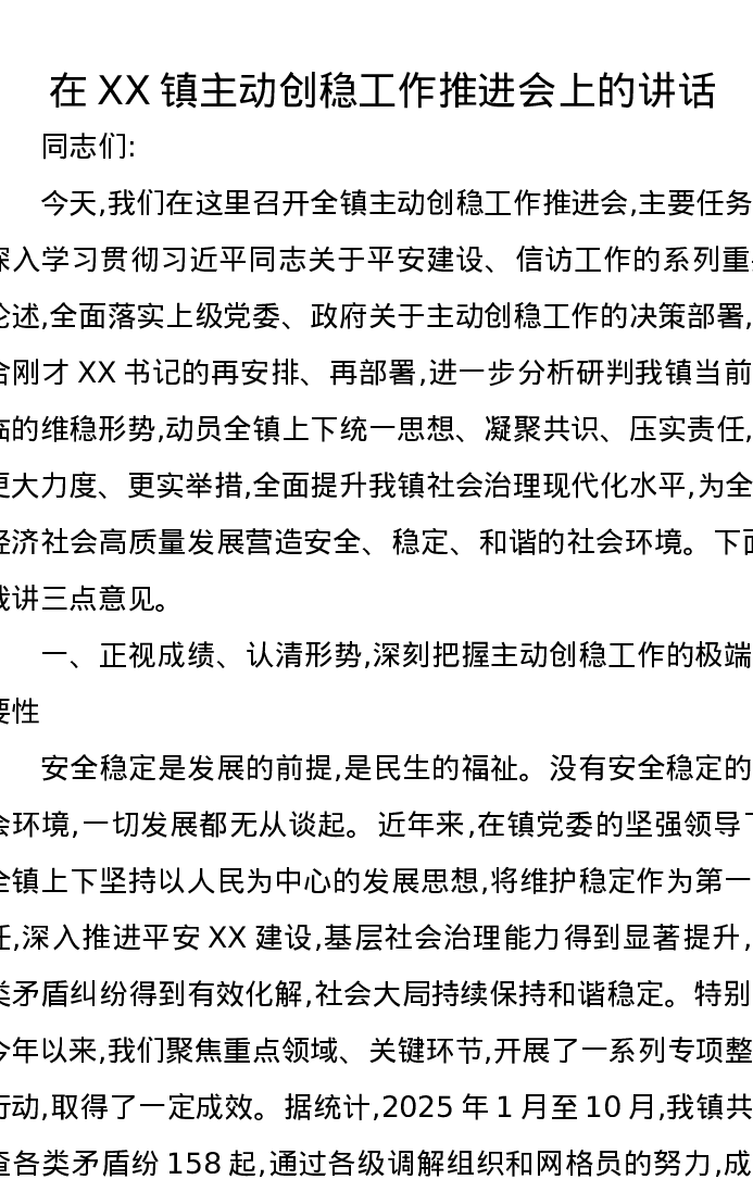 在XX镇主动创稳工作推进会上的讲话