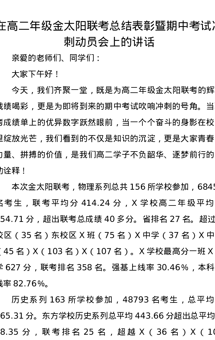 在高二年级金太阳联考总结表彰暨期中考试冲刺动员会上的讲话