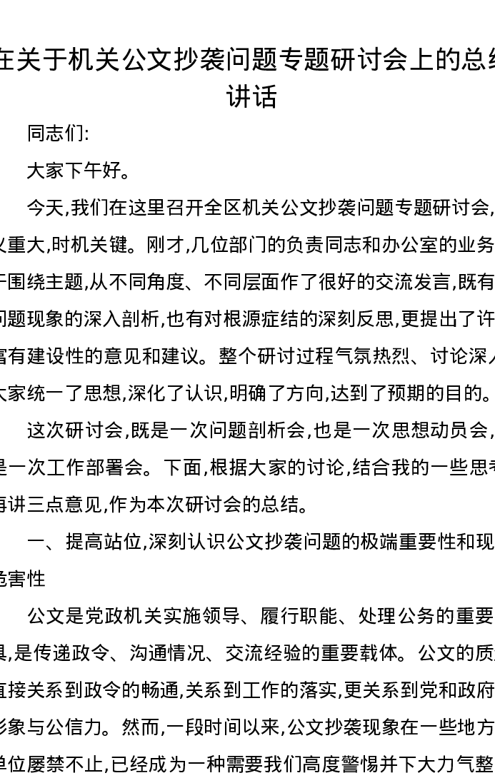 在关于机关公文抄袭问题专题研讨会上的总结讲话