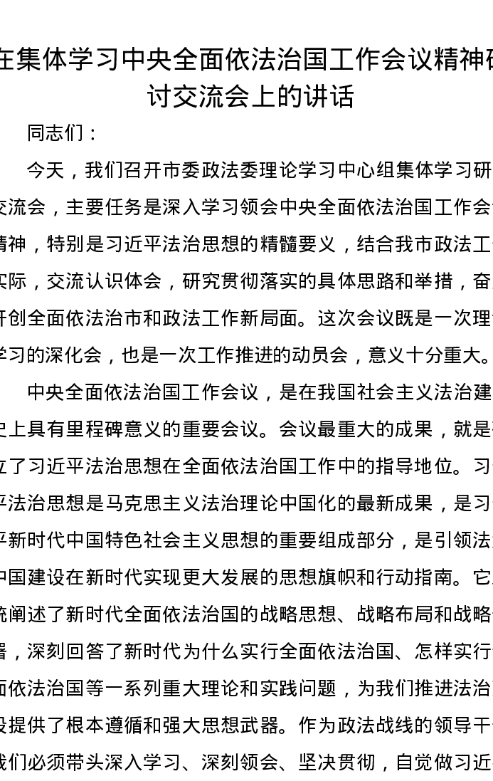 在集体学习中央全面依法治国工作会议精神研讨交流会上的讲话