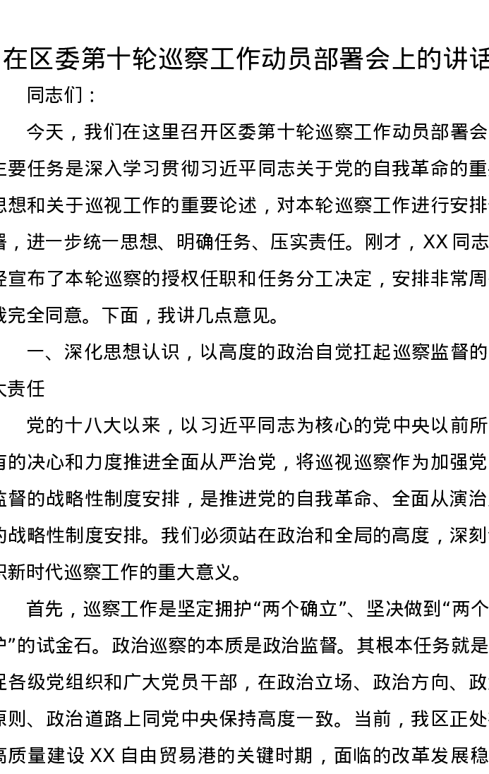 在区委第十轮巡察工作动员部署会上的讲话