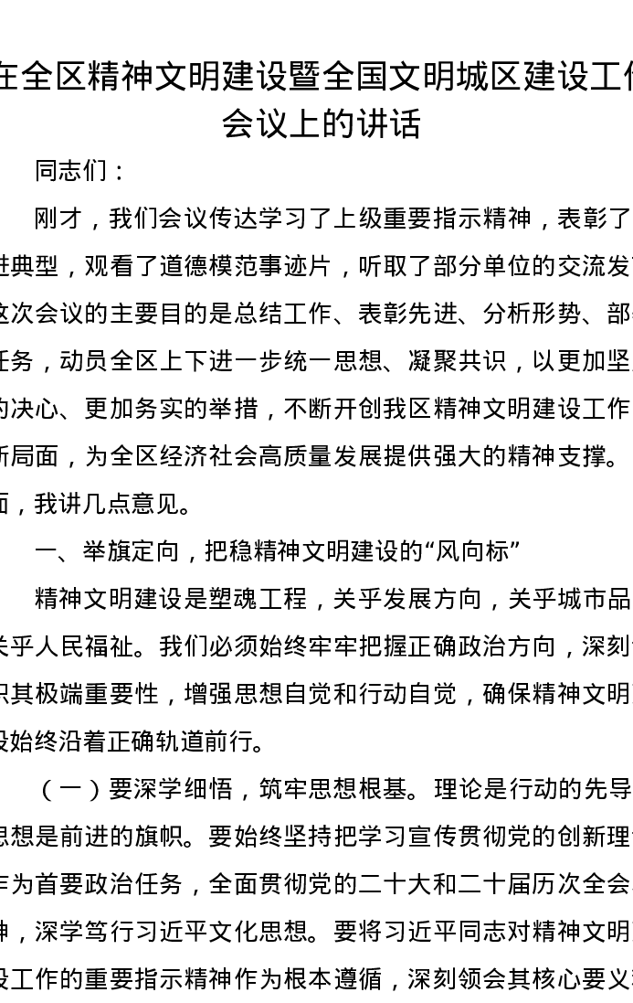 在全区精神文明建设暨全国文明城区建设工作会议上的讲话