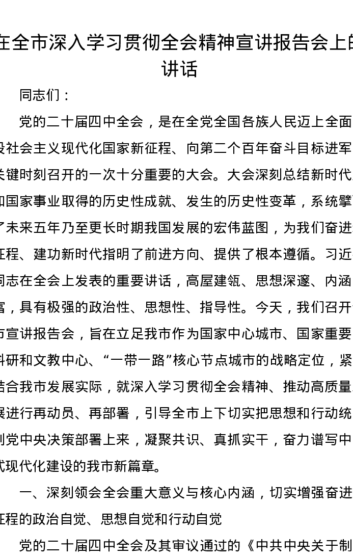 在全市深入学习贯彻二十届四中全会精神宣讲报告会上的讲话