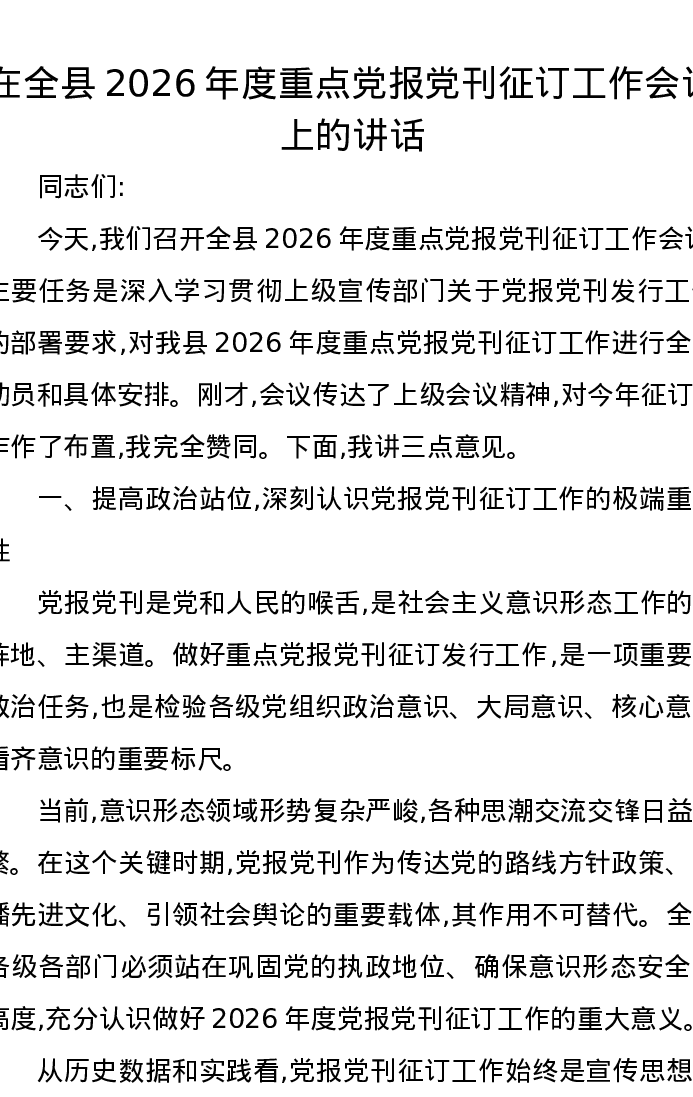 在全县2026年度重点党报党刊征订工作会议上的讲话