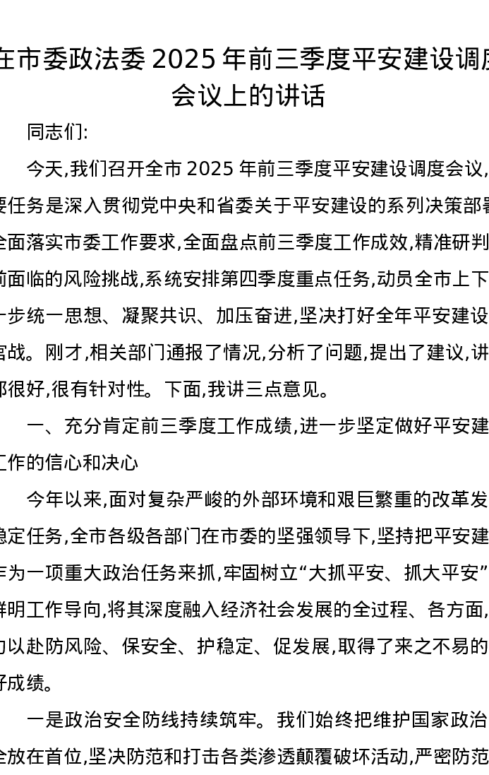 在市委政法委2025年前三季度平安建设调度会议上的讲话