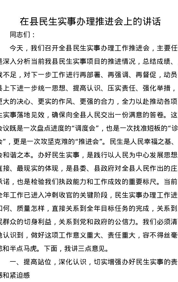 在县民生实事办理推进会上的讲话
