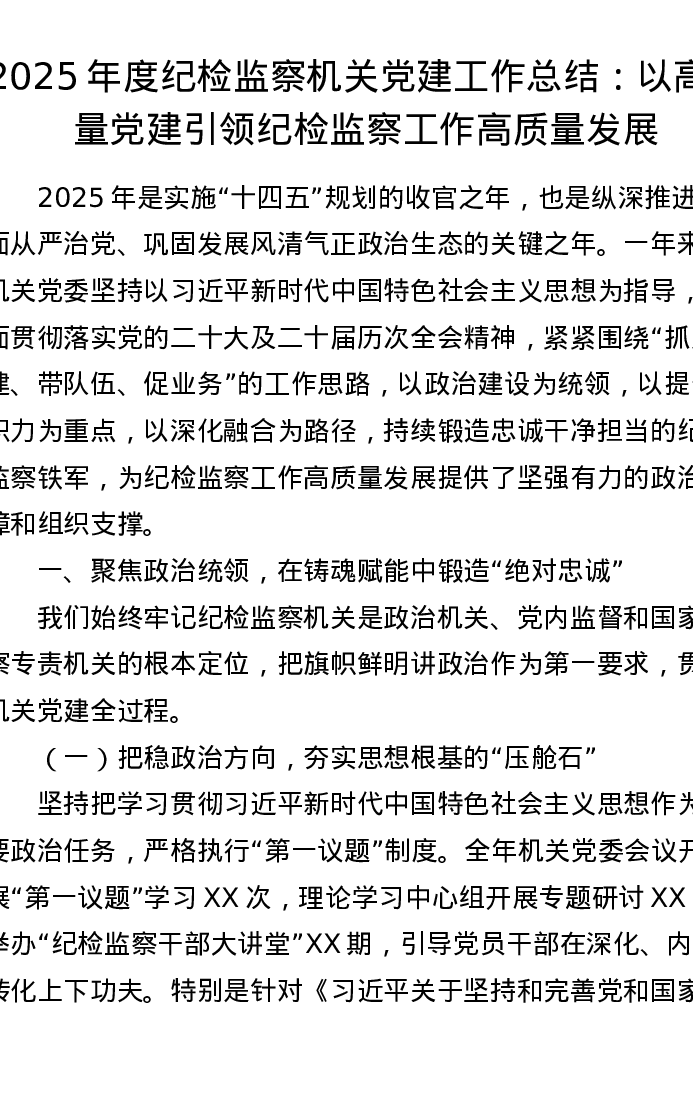 2025年度纪检监察机关党建工作总结:以高质量党建引领纪检监察工作高质量发展