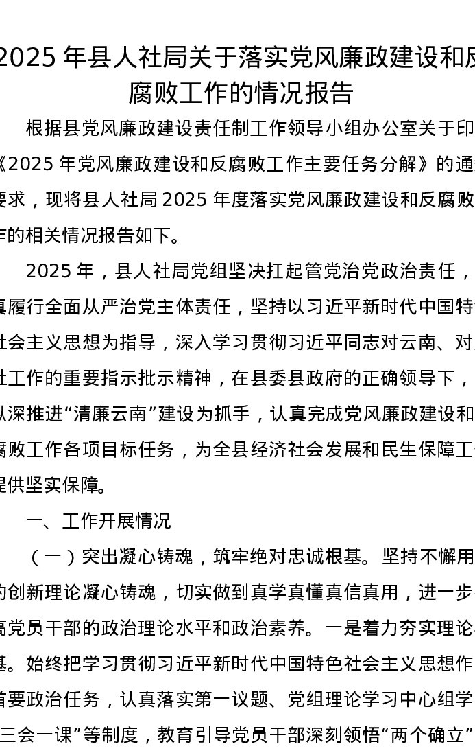 2025年县人社局关于落实党风廉政建设和反腐败工作的情况报告