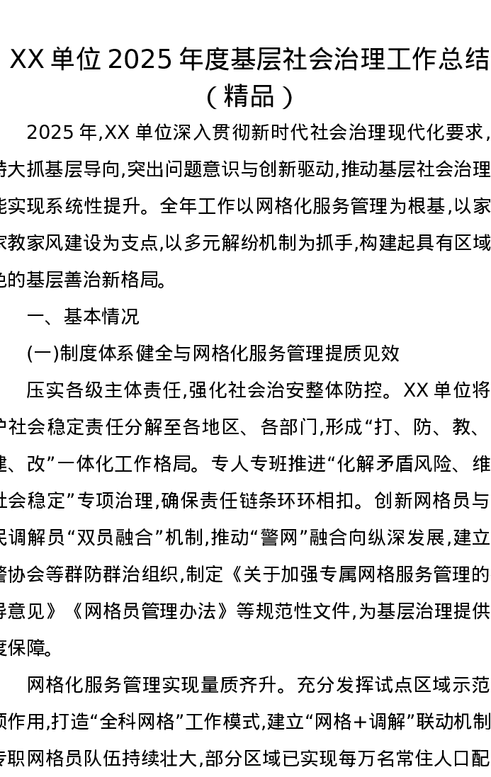 XX单位2025年度基层社会治理工作总结