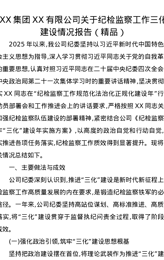 XX集团XX有限公司关于纪检监察工作三化建设情况报告