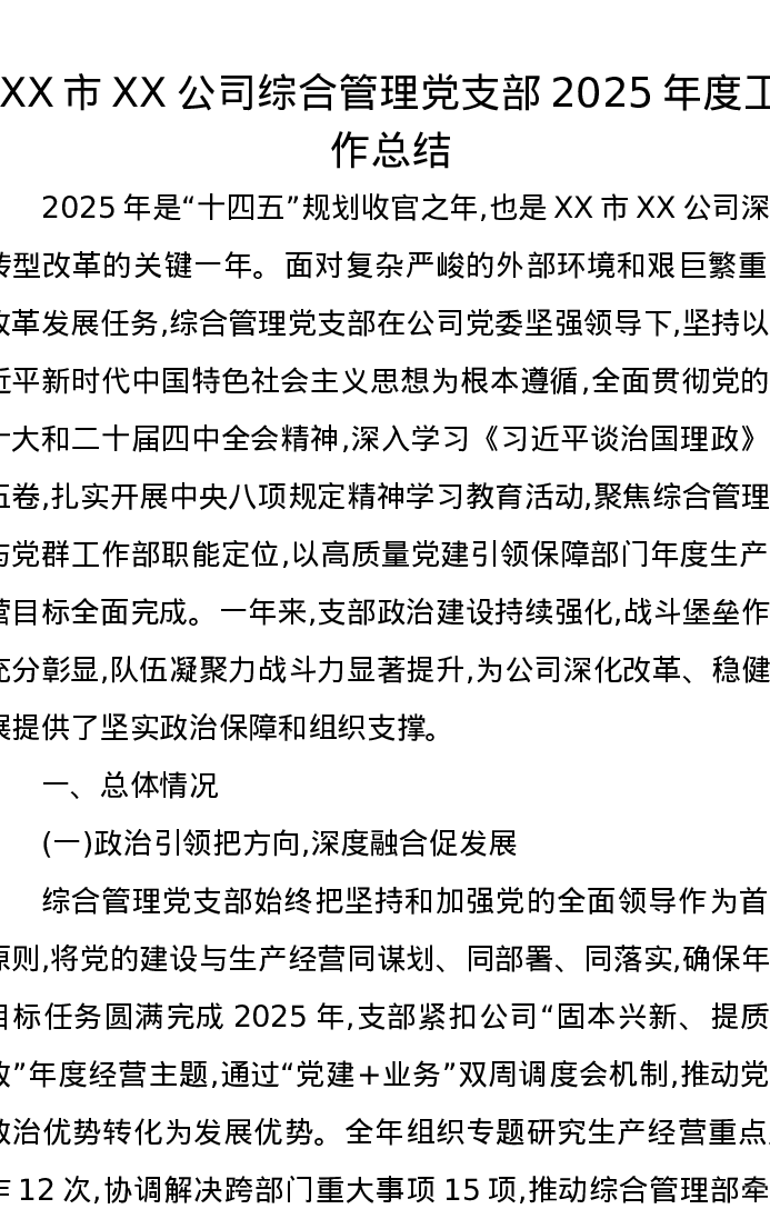 XX市XX公司综合管理党支部2025年度工作总结