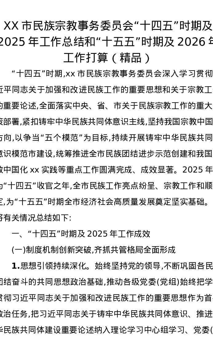 XX市民族宗教事务委员会“十四五”时期及2025年工作总结和“十五五”时期及2026年工作打算(精品)