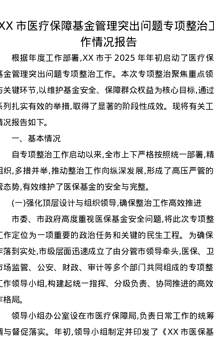 XX市医疗保障基金管理突出问题专项整治工作情况报告