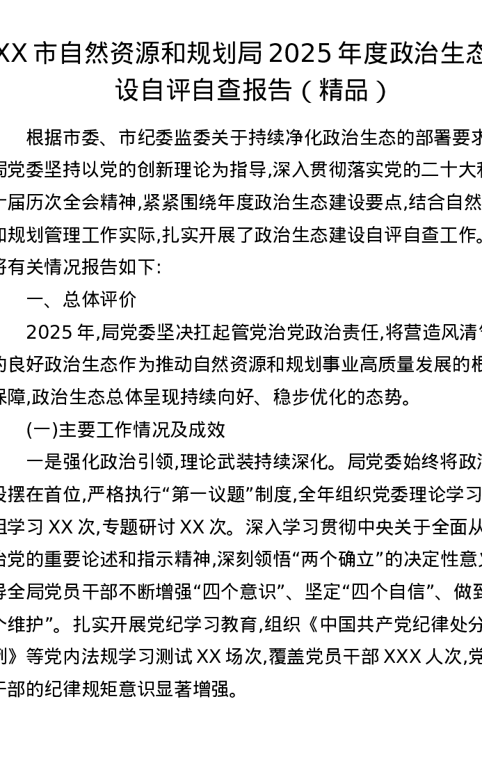 XX市自然资源和规划局2025年度政治生态建设自评自查报告