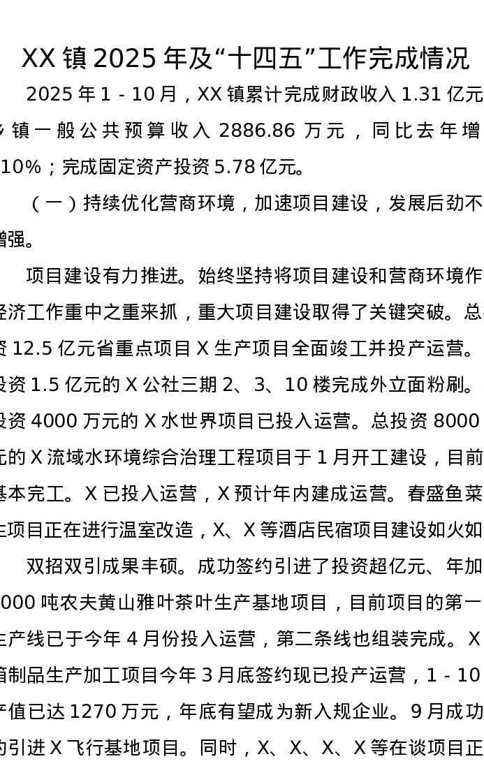 XX镇2025年及“十四五”工作完成情况报告