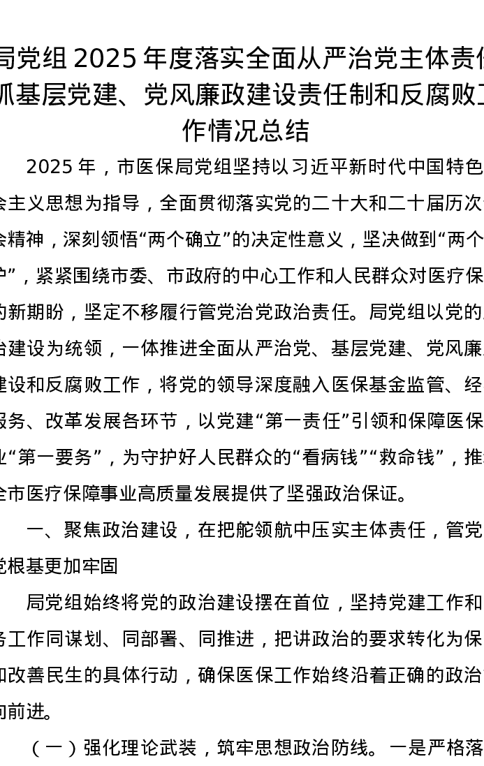局党组2025年度落实全面从严治党主体责任、抓基层党建、党风廉政建设责任制和反腐败工作情况总结