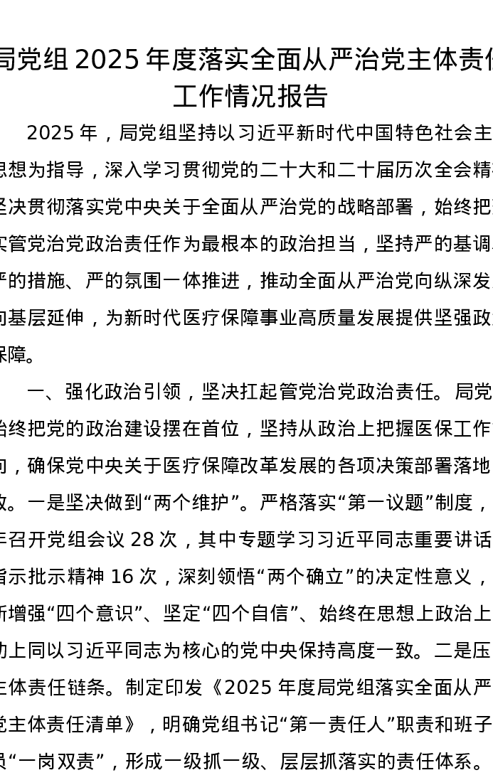 局党组2025年度落实全面从严治党主体责任工作情况报告