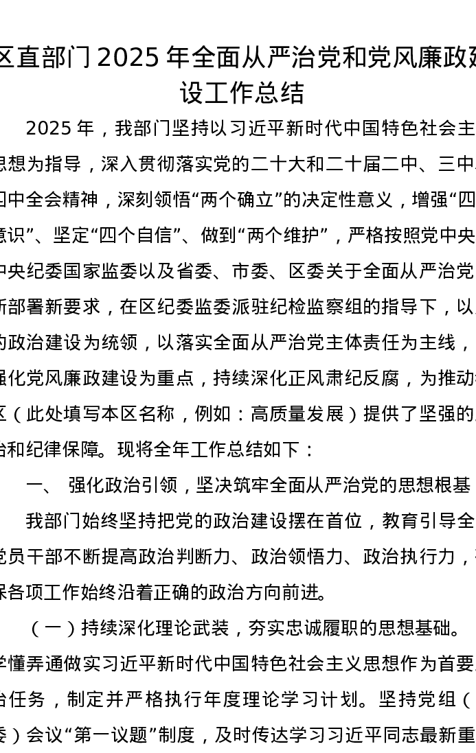 区直部门2025年全面从严治党和党风廉政建设工作总结