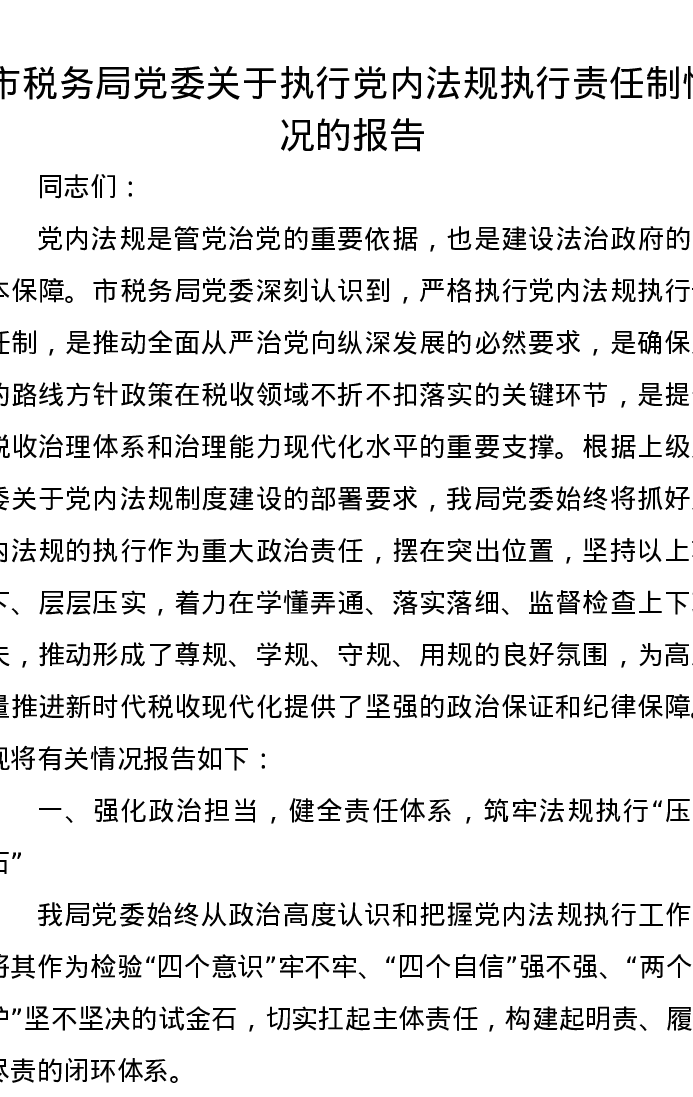 市税务局党委关于执行党内法规执行责任制情况的报告