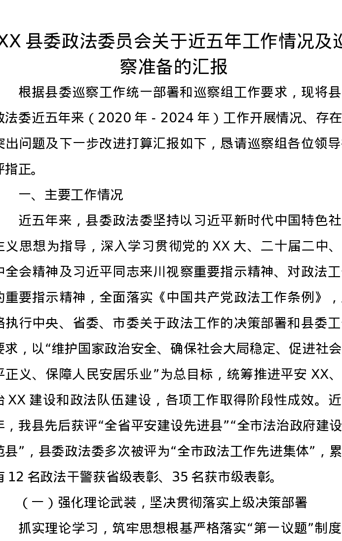 XX县委政法委员会关于近五年工作情况及巡察准备的汇报