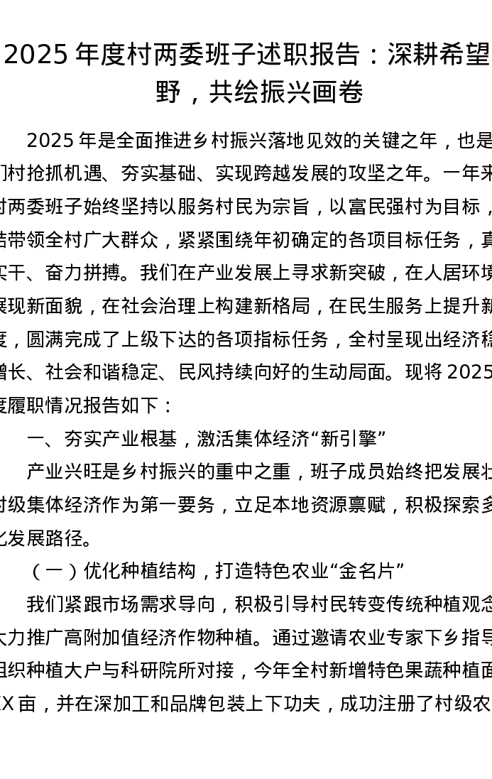 2025年度村两委班子述职报告:深耕希望田野,共绘振兴画卷