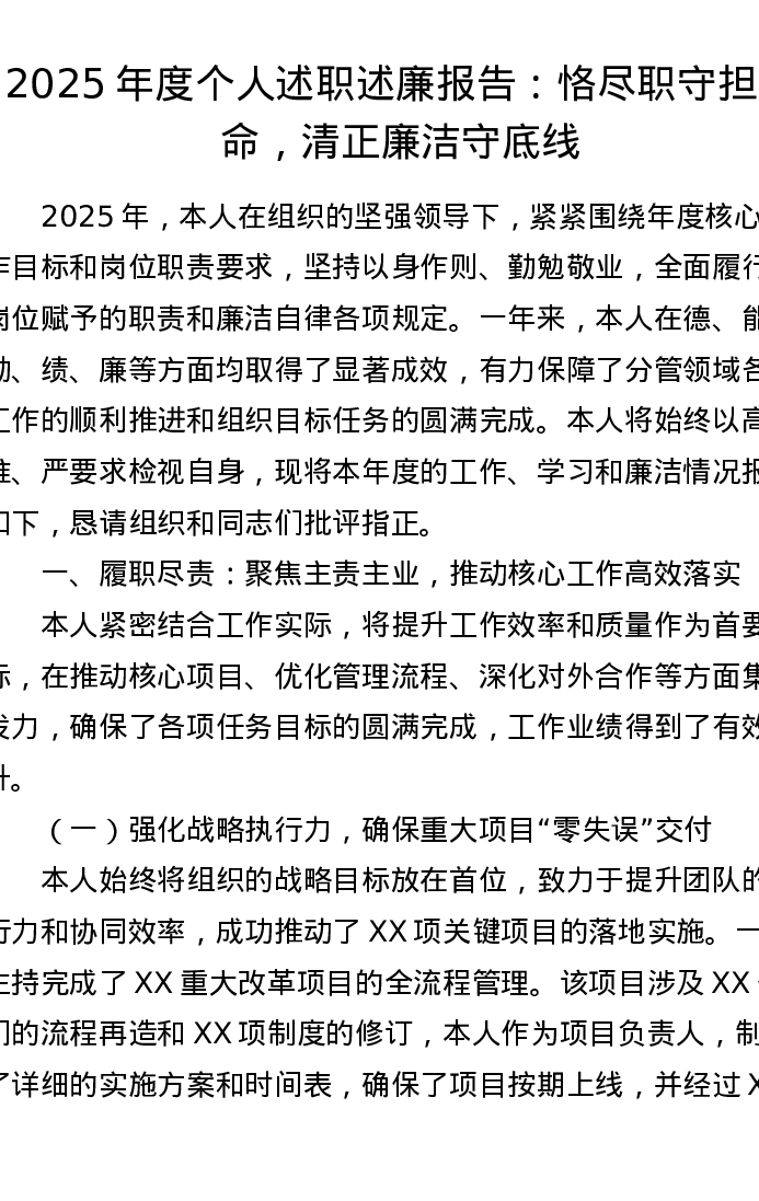 2025年度个人述职述廉报告:恪尽职守担使命,清正廉洁守底线
