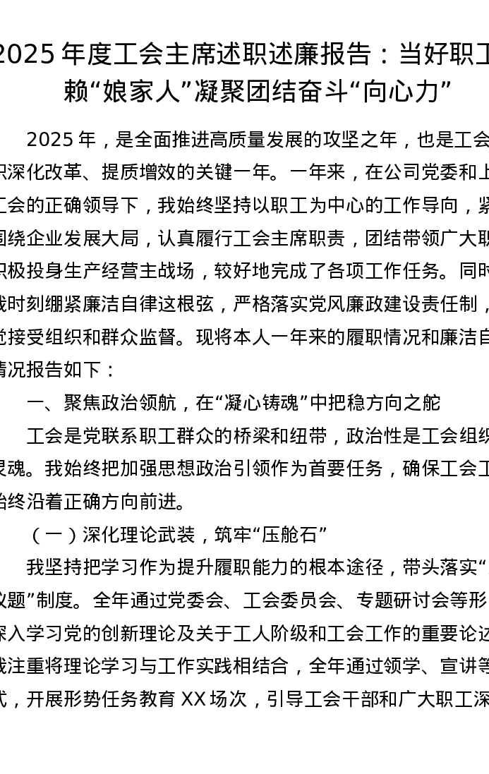 2025年度工会主席述职述廉报告:当好职工信赖“娘家人” 凝聚团结奋斗“向心力”