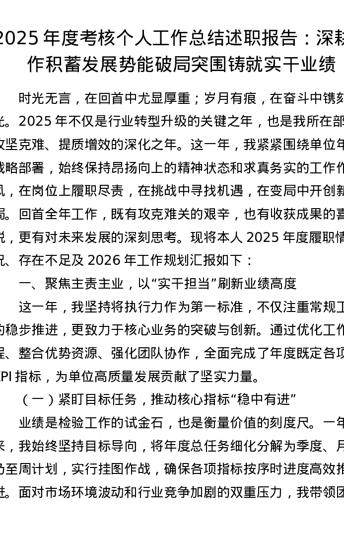 2025年度考核个人工作总结述职报告:深耕细作积蓄发展势能 破局突围铸就实干业绩
