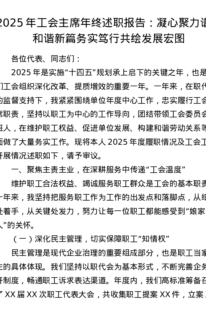 2025年工会主席年终述职报告:凝心聚力谱写和谐新篇 务实笃行共绘发展宏图