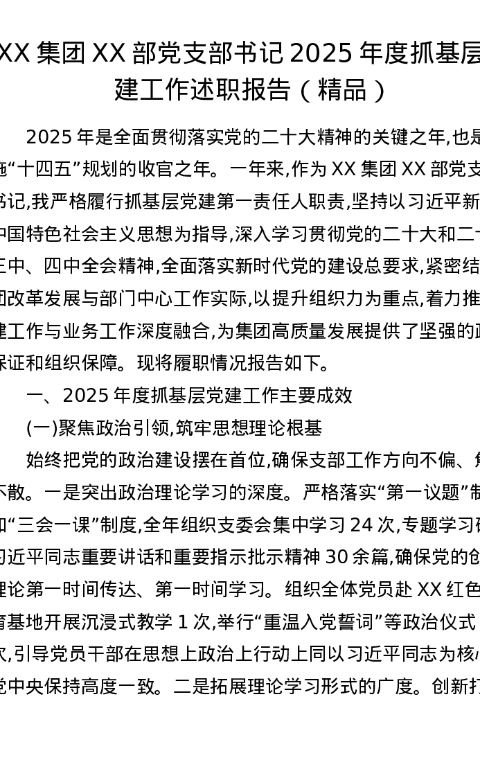 XX集团XX部党支部书记2025年度抓基层党建工作述职报告