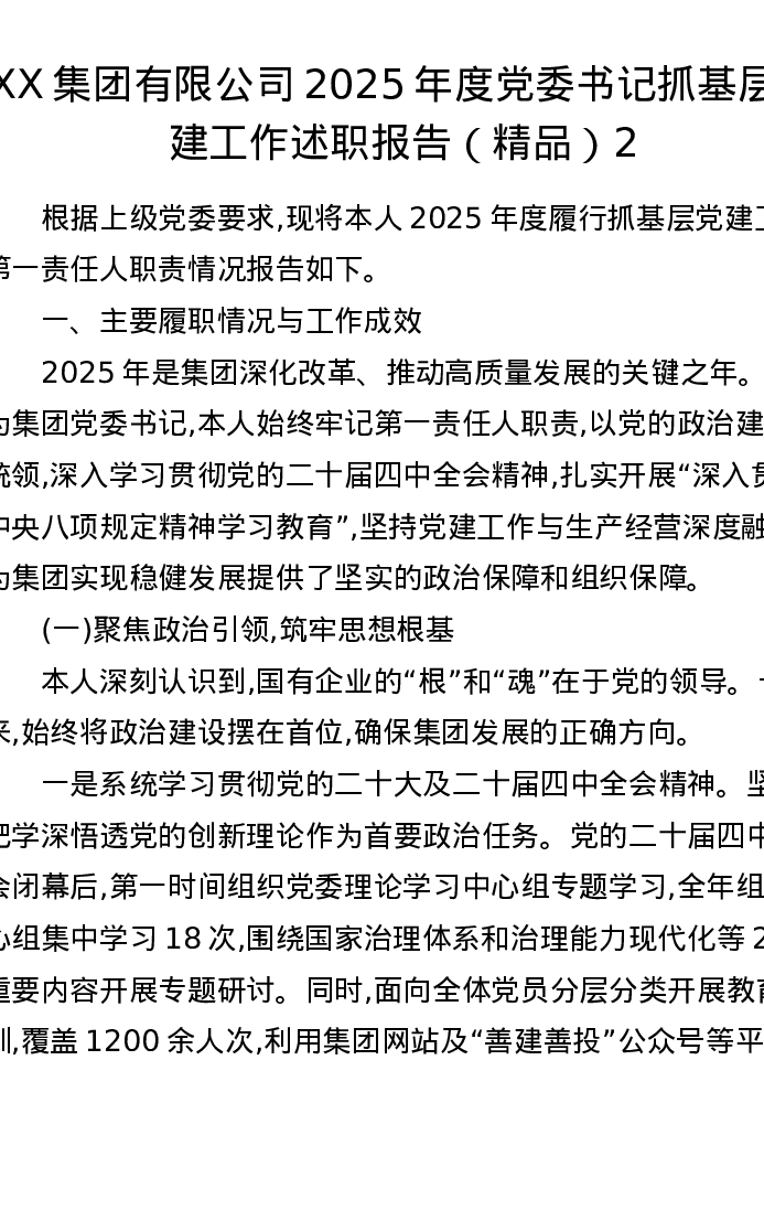 XX集团有限公司2025年度党委书记抓基层党建工作述职报告2