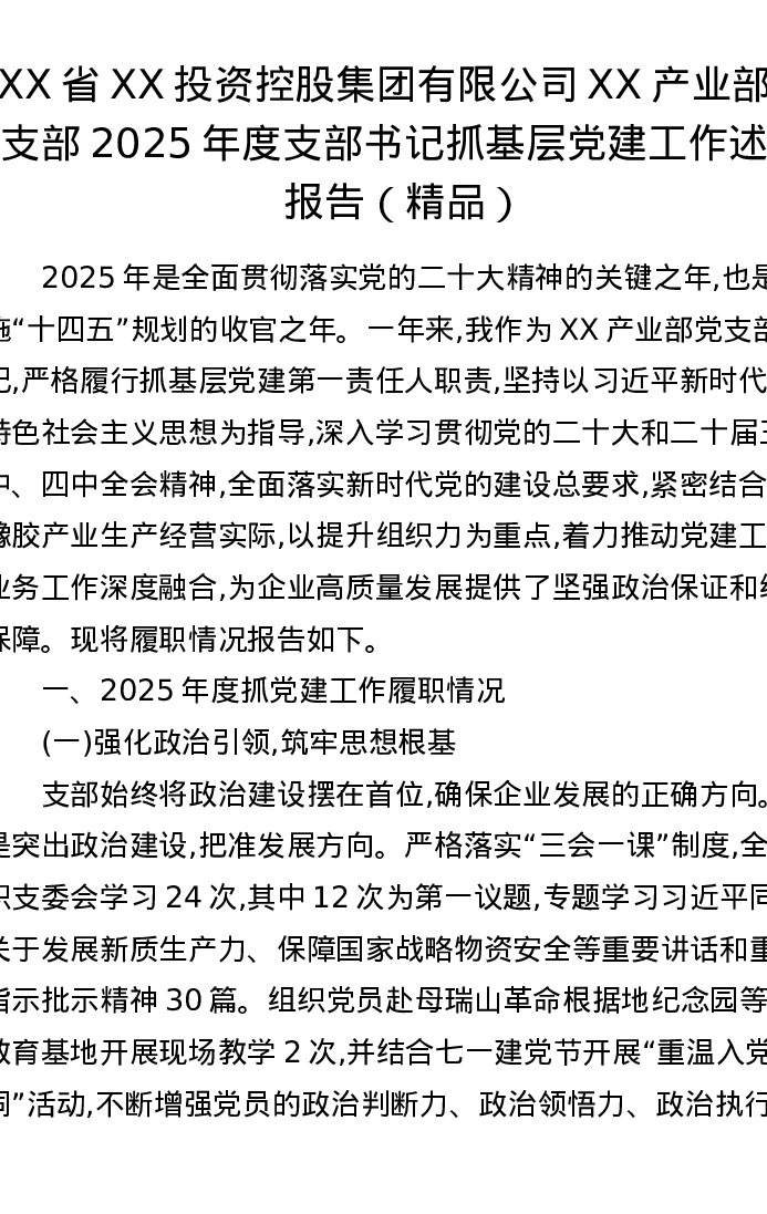 XX省XX投资控股集团有限公司XX产业部党支部2025年度支部书记抓基层党建工作述职报告