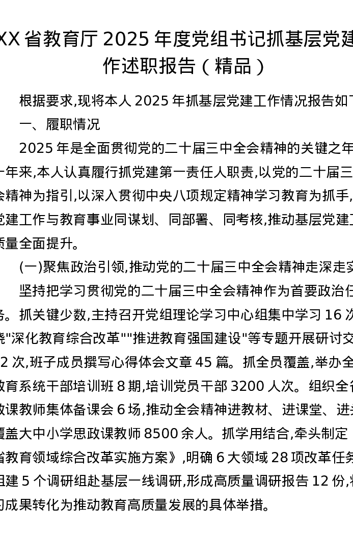 XX省教育厅2025年度党组书记抓基层党建工作述职报告
