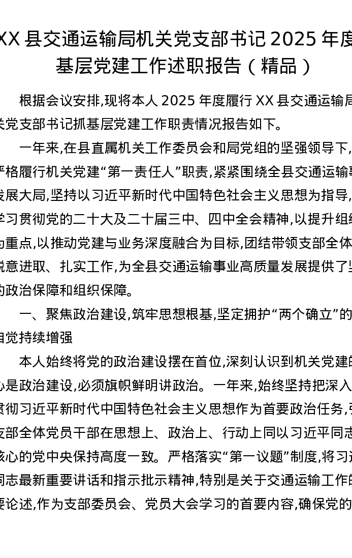 XX县交通运输局机关党支部书记2025年度抓基层党建工作述职报告