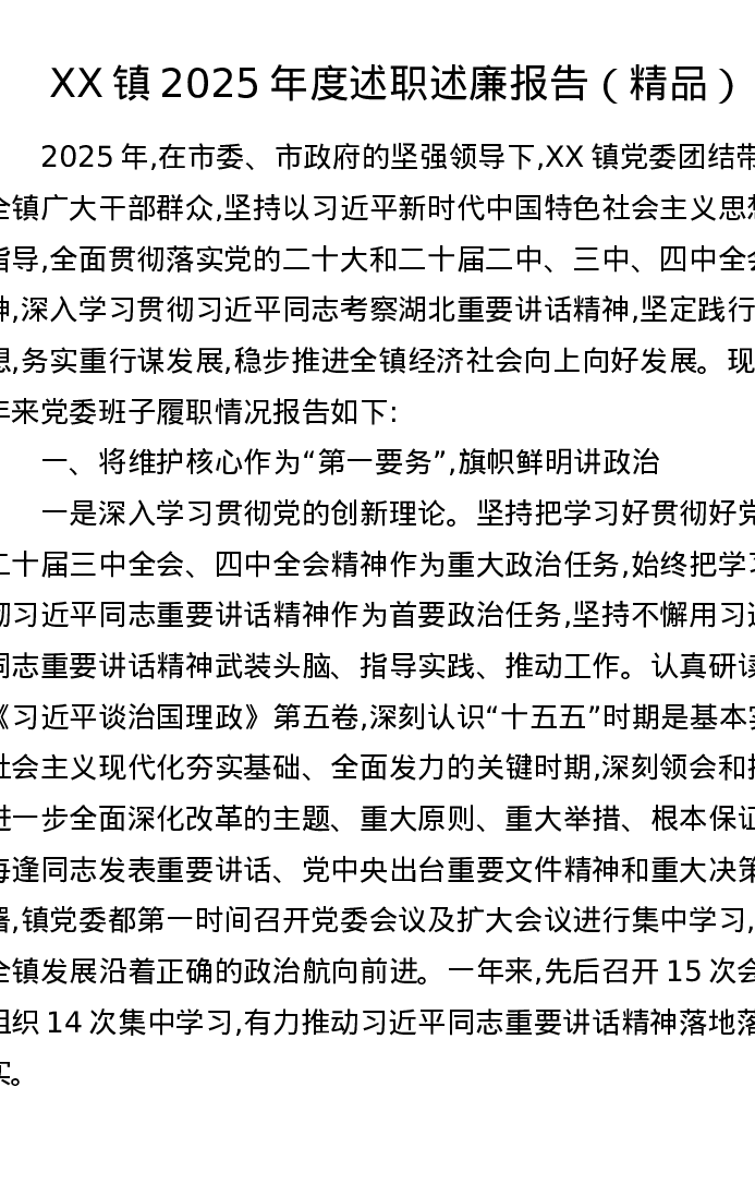 XX镇2025年度述职述廉报告