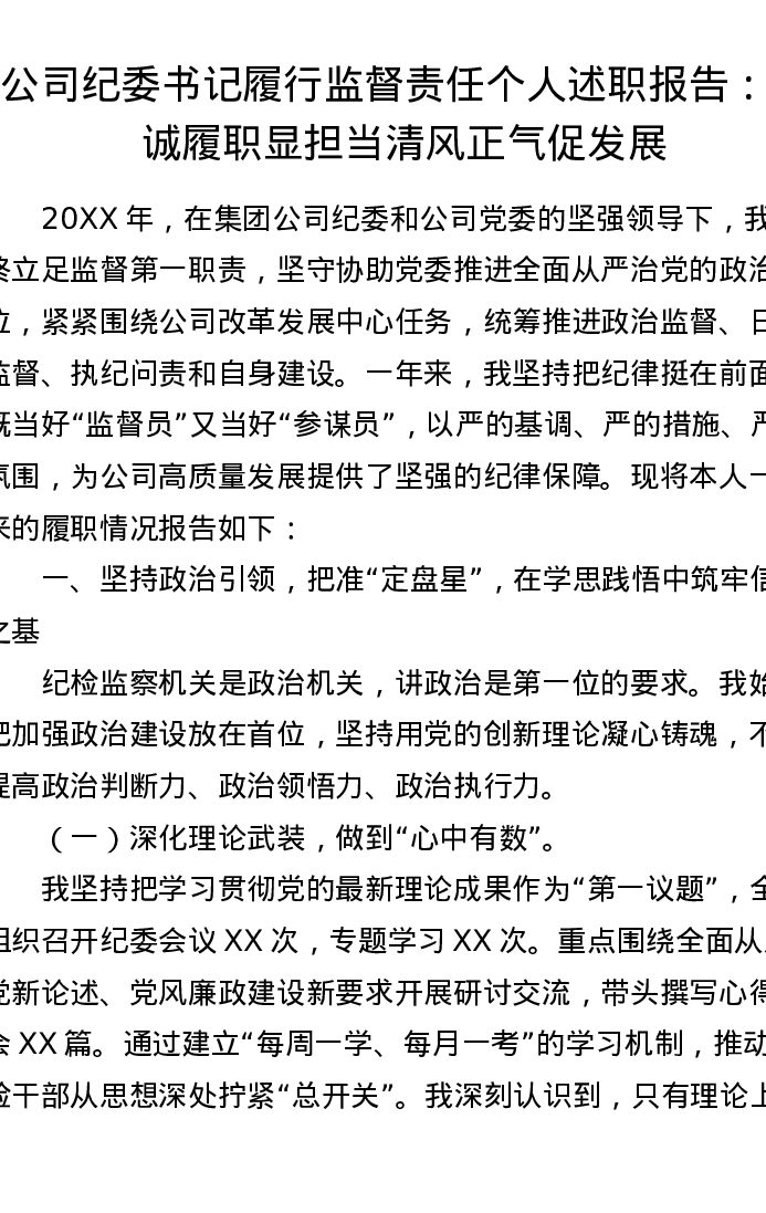公司纪委书记履行监督责任个人述职报告:忠诚履职显担当 清风正气促发展