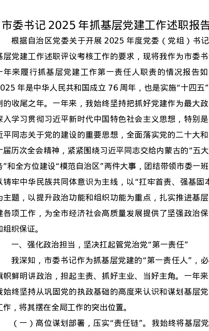 市委书记2025年抓基层党建工作述职报告