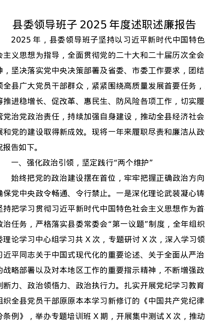 县委领导班子2025年度述职述廉报告